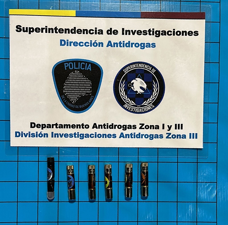 Como resultado fueron secuestradas 17 jeringas con stickers que indicaban el sabor del contenido (Blueberry, Limón, Cherry) y el logo de un “yelmo espartano” a modo de marca comercial; tres “vaper” y siete cartuchos conteniendo a simple vista la misma sustancia, dos celulares y 30 dólares.